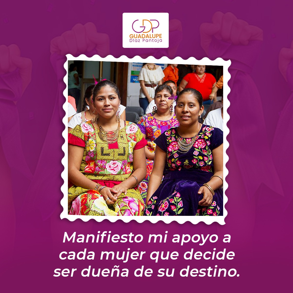 Está firmemente comprometida en fomentar la participación política de las mujeres y así construir a través de su liderazgo un mejor futuro para Oaxaca.Guadalupe Díaz Pantoja es una mujer oaxaqueña que demuestra que con tenacidad, preparación y una visión clara del bienestar social se pueden transformar realidades. Originaria de San Pedro Totolápam, Oaxaca, Lupita Díaz dedica su vida a construir un mejor futuro para su estado.